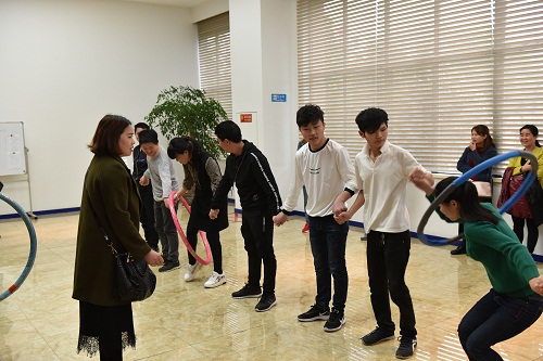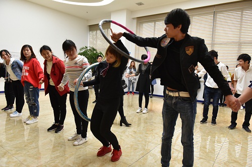 一个呼啦圈, ,,,,,,,将一个整体连在一起, ,,,,,,,除了牢牢牵牢双手的选手, ,,,,,,,尚有场外给他们助阵的众多“战友”, ,,,,,,,加油声、欢笑声在一楼大厅回荡……